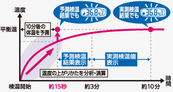 検温を開始してからの体温の変化を、当社独自の分析・演算技術で高速演算処理し、約15秒で約10分後の体温を予測します。すばやく検温できるので、じっとしていられないお子さまの検温も安心です。